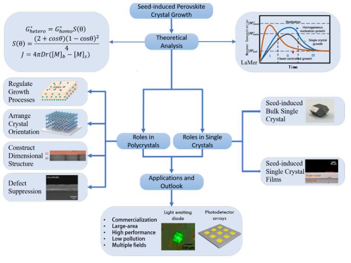 Junjie Ma’s team at Zhengzhou University and Yanlin Song’s team at the Institute of Chemistry, Chinese Academy of Sciences outlined the latest progress in perovskite seed-induced PSCs growth methods. In this review, we first explain the formation mechanism of perovskite films, including the nucleation and growth mechanisms of perovskite films with or without seeds, as well as the differences between single crystals and polycrystals. Secondly, we briefly review the existing methods for optimizing perovskite polycrystalline films, and systematically reveal the key role of seed templates in driving the controllable growth of perovskites, including crystallization regulation, orientation arrangement, dimensional structure construction, and defect suppression. . Furthermore, insights into substantial advances in single crystal growth systems are provided, followed by a discussion of their application prospects in electronic and optoelectronic devices, including solar cells, LEDs, etc. Finally, the development of innovative technologies in seeds and the commercial development prospects of perovskites are prospected.