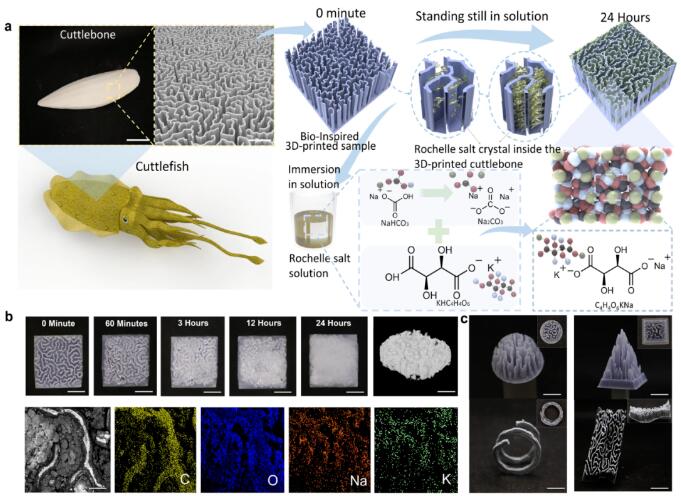 1. RS crystals were grown in 3D printed cuttlebone structures, and these crystals were used to create smart monitoring devices with integrated mechanical protection and sensing functions.