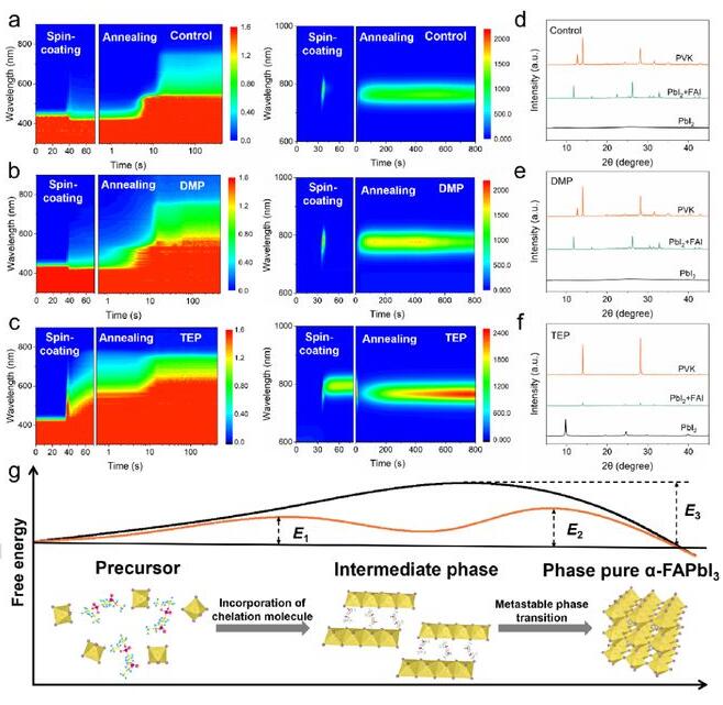 Here, Pengwei Li, Yiqiang Zhang from Zhengzhou University, and Yanlin Song from the Institute of Chemistry of the Chinese Academy of Sciences proposed a process to efficiently convert PbI2 to α-FAPbI3 perovskite in ambient air. This conversion is facilitated by the introduction of chelating molecules, which interact with PbI2 to form an intermediate phase. This stable intermediate phase directly transforms to α-FAPbI3 after deposition from an organic cation solution, effectively bypassing the formation of δ-FAPbI3, due to a reduced formation barrier caused by an altered reaction pathway.